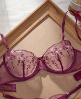Wrapped in rich wine tones, this embroidered lingerie set blends romance with luxury. Delicate floral embroidery rests on sheer mesh cups, offering light support with a sensual silhouette. A refined choice for women who love elegance with a seductive edge.