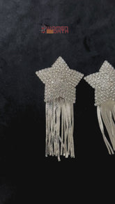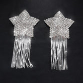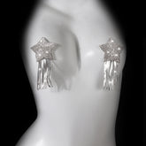 Shine boldly with these crystal star tassel nipple covers, designed to sparkle from every angle. Featuring dazzling rhinestone star appliqués with cascading fringe tassels, this statement lingerie accessory adds dramatic glamour and playful movement. Perfect for boudoir styling, festivals, performances, clubwear, or daring fashion looks.