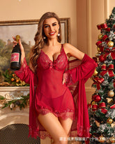 A luxurious wine-colored lace chemise paired with a flowy sheer robe for effortless elegance. Delicate lace cups, soft stretch fabric, and a flattering mid-thigh length make this set perfect for bridal trousseau, romantic evenings, and luxury sleepwear lovers.
